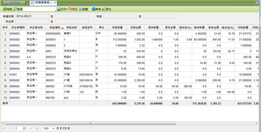 【主要功能】从供应商、物品等角度统计某一时间段内采购量、退货量、退货率、换货量、换货率等,利于用户对退货率、换货率较高的数据进行关注。