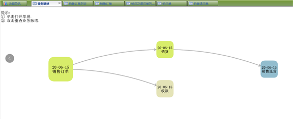 针对当前单据的业务脉络查询。与销售订单直接相关的业务单据有销货单、收款单。