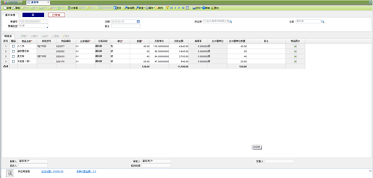 - 现存量:显示光标所在物品行的现存量,光标换行后更新。提供超链接,可通过点击链接打开联查—库存查询功能,查看当前光标所在物品行的库存明细。界面编辑状态如果光标不在明细表行通过链接打开联查—库存查询功能,显示所有物品的库存明细。