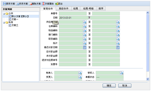 - 保存方案:可以把查询条件所有页签内容设置完成后,可以点【保存方案】保存到方案列表,以便下次查询时使用,以节约您的时间。