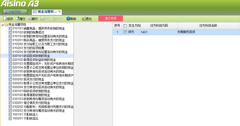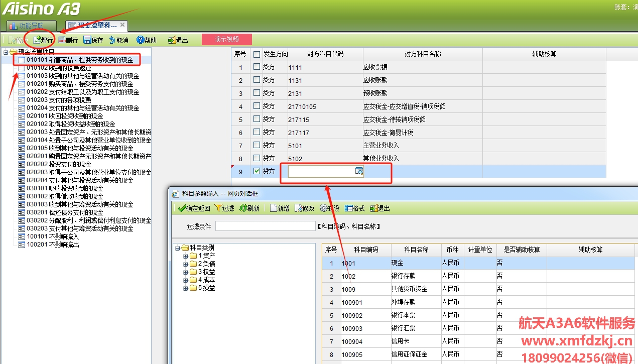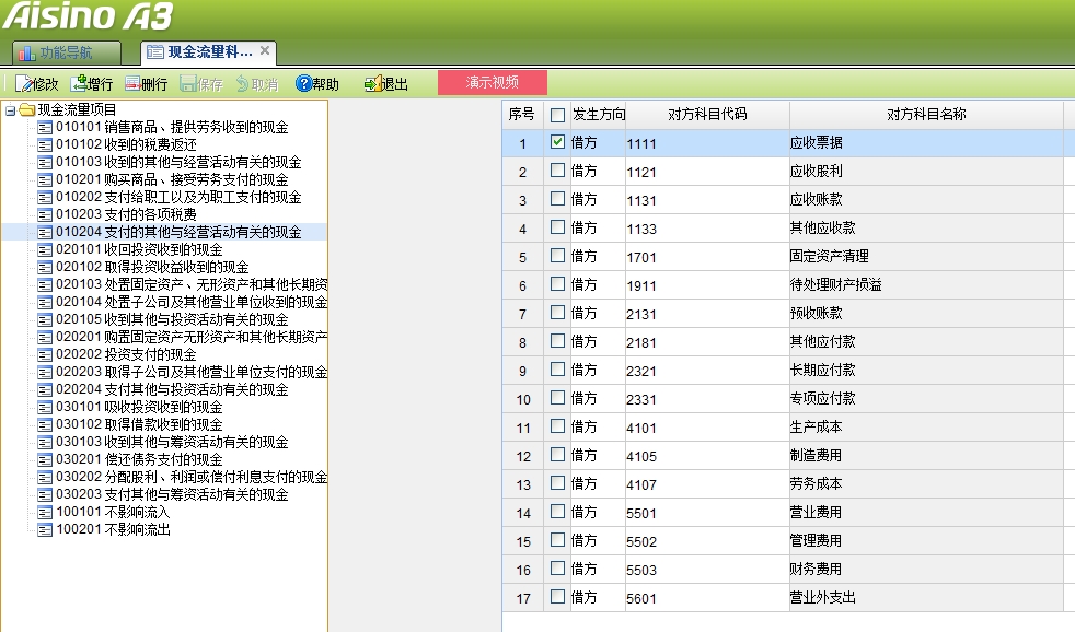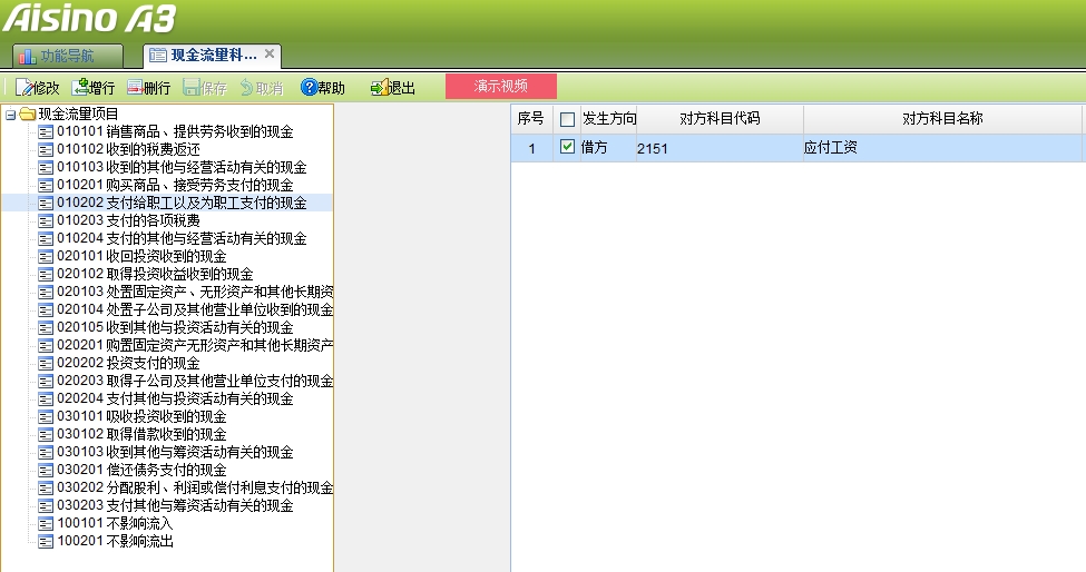 选择左侧相应的现金流量项目,点击【增行】按钮,选择对应科目,【保存】完成