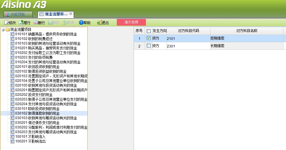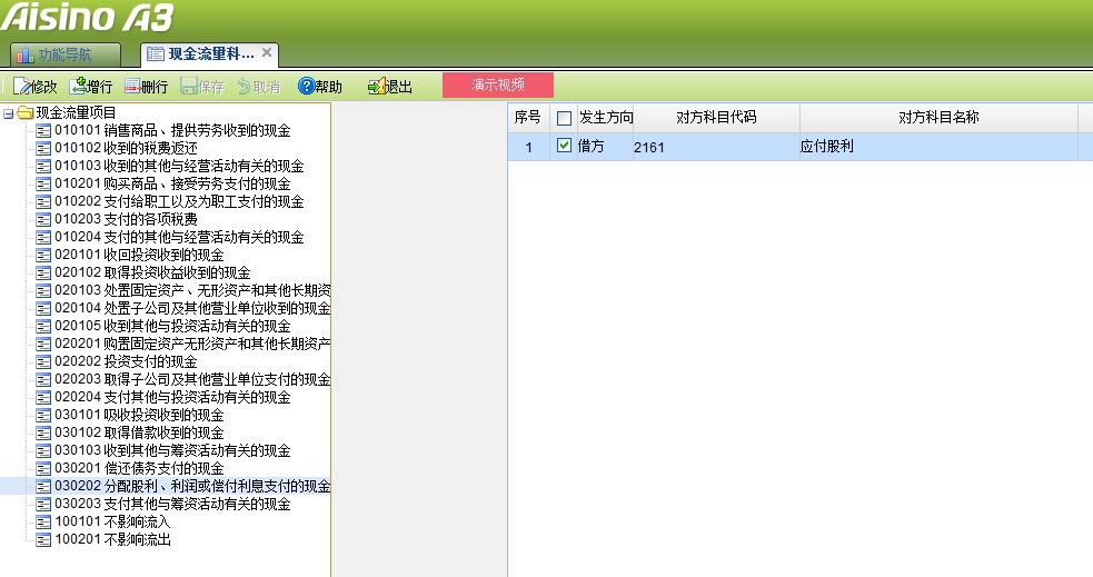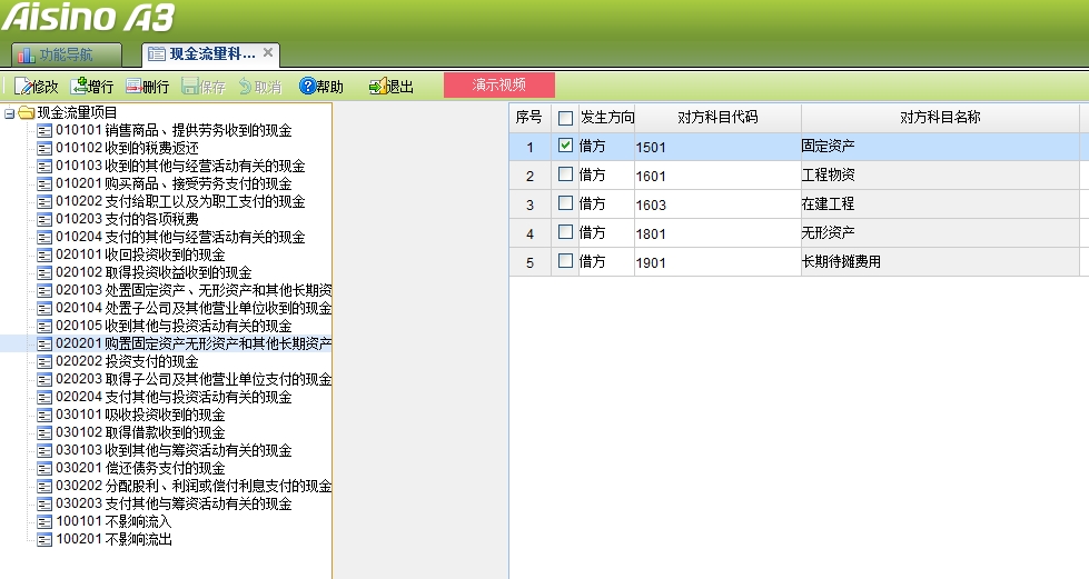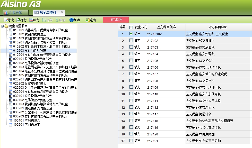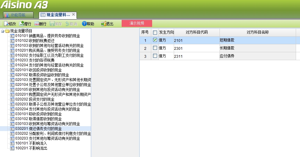 182 浏览航天信息A3财务软件 A3v5.x 常用现金流量科目设置操作说明: