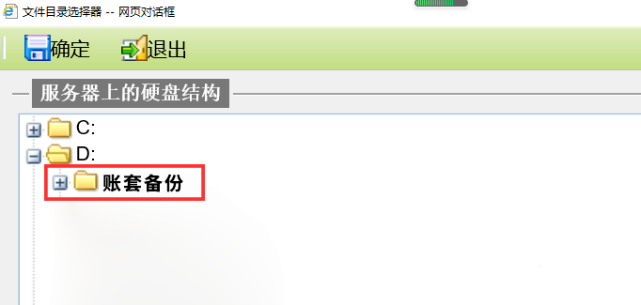 (3)在路径选择界面中找到D盘里新建的“账套备份”的文件夹,选择并选中,然后点击“确定”按钮