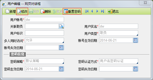 【* 步】以admin登录系统,打开用户管理,在用户管理页面,选中需要重置密码的用户,双击进入用户编辑界面,点击〖重置密码〗按钮,系统自动将改用户密码重置成默认策略中的密码。