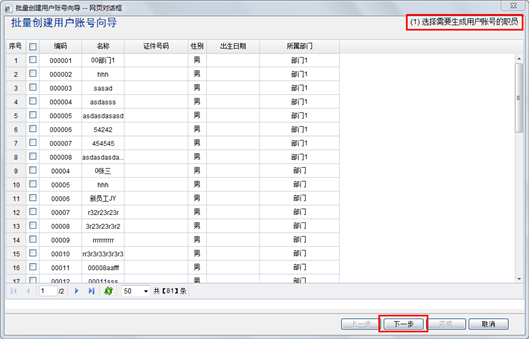 【* 步】在用户管理列表,点〖批量新增〗按钮,弹出批量创建用户账号向导界面,首先选择需要生成用户账号的职员(此处列出的是所有未关联用户的职员)。