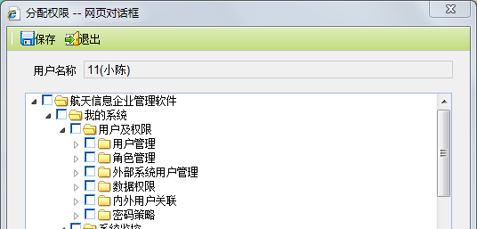 【第二步】在分配权限页面,为用户选择相应的功能权限后,点击〖保存〗按钮,完成用户功能权限设置,点击〖退出〗关闭页面。