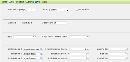凭证日期为当前计提期间最后一天的凭证金额]的差额,带入至最新生成的凭证中;若三项附加税差额都为0,则在点击生成凭证按钮时提示 “待计提附加税科目金额均为0,不需要再生成凭证”。