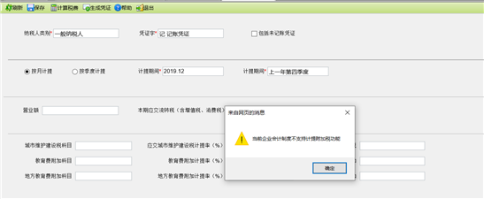 系统仅支持使用2010新会计准则、小企业会计准则、企业制度的企业使用此功能;不计提附加税可结账。如当前账套使用的行业会计制度不是小企业会计准则/企业制度/2010新会计准则时,进入计提附加税功能提示,如下图: