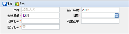 【第三步】修改汇率,并通过〖保存〗按钮进行保存。此处只能修改汇率“会计年度、会计期间、记账汇率、调整汇率”信息。
