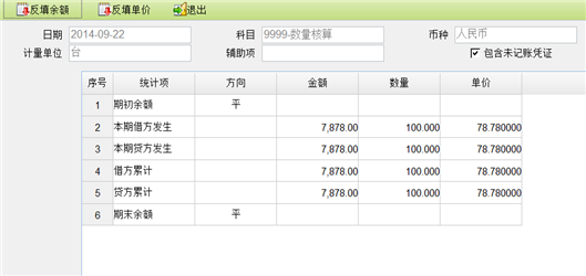 按钮,系统自动将单价反填入凭证,此功能主要是给用户平账用。如:应收账款科目余额 借500,点击