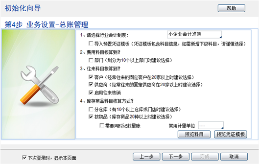 为了使用户根据本企业特点,尽快完成系统的相关设置,可通过初始化向导: