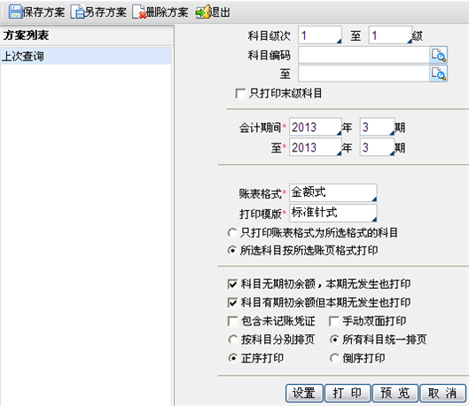 - 科目无期初余额,本期无发生也打印:如勾选,科目期初为0,无发生,也打印账表;否则,不打印。
