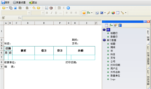 在此页面,可直接将变量拖拉到单元格中,还可以添加文本框、图片、线条、统计图、树列表。可将设置好的打印模板设置为默认模板,方便以后打印。