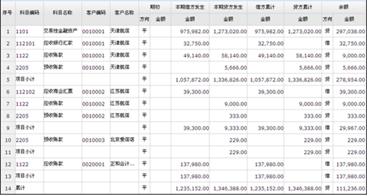若查询条件勾选了“按核算项目小计”则查询结果按核算项目排序并显示项目小计行,如下图: