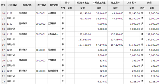 若查询条件同时勾选了“按科目小计”和“按核算项目小计”则查询结果按科目排序每科目再按核算项目排序,若一科目有多个核算项目则显示多个项目小计,如下图: