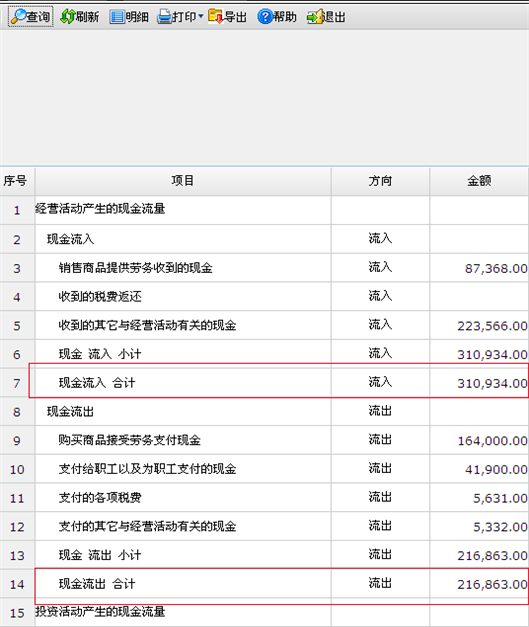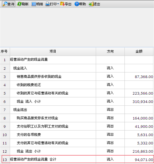 - 选择明细行,点击〖明细〗按钮,可联查现金流量明细表。