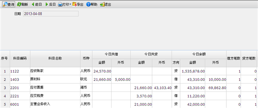 【主要功能】查看某日所有科目的发生额及余额情况(不包含现金、银行科目)。同时可以打印所查询的科目日报表。