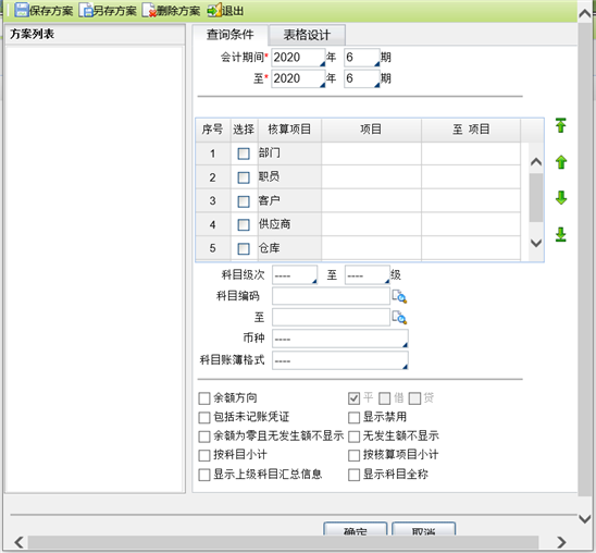 - 核算项目:选择所需查询的辅助核算,并可录入具体辅助项范围进行查询。可同时勾选多个辅助核算,多个辅助核算之间是并的关系。如:同时勾选“部门”和“职员”,则显示带部门和职员核算的科目,不显示只带部门或只带职员的科目。