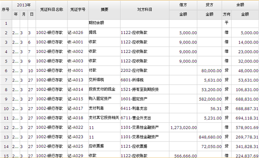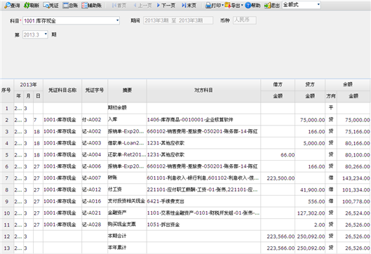 2、选择明细行,点击〖总账〗按钮,可联查总账。