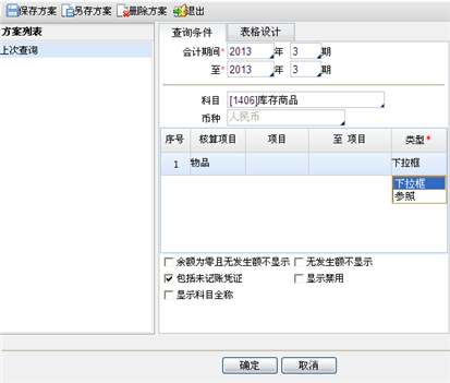 - 类型:设置查询结果页面核算项目选择方式的类型,可选项有:下拉、参照。