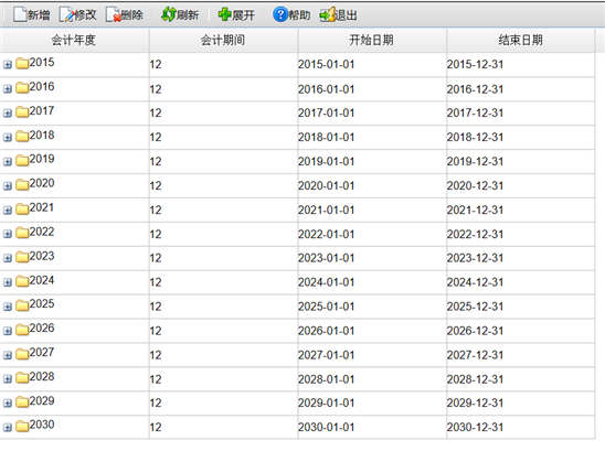 1.本软件预置了16年的会计年度。所以用户无需进行年度结转工作。但可以根据企业启用日期增加、删除会计年度。