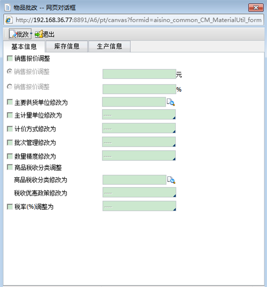 通过批改功能,可以对物品批量修改销售报价、税率等基本信息和库存相关信息和生产相关信息。可通过批改下拉按钮选择批改所有物品或批改在物品列表中所选的物品。