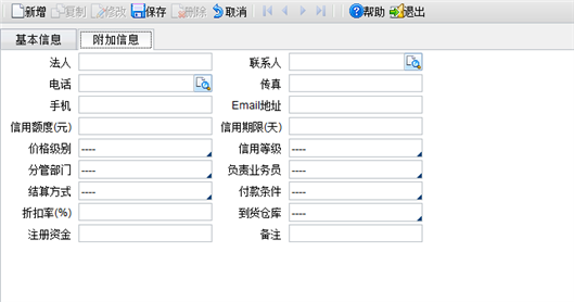 信用额度 | 填写供应商的信用额度,信用额度设定后,将与销售子系统参数设置中的信用控制和控制单据同时使用。 |