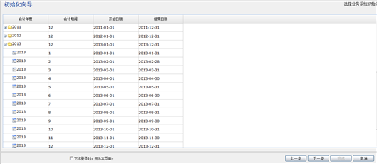 【第三步】设置系统启用的会计年度、会计期间信息,如下图所示,点击“下一步”按钮。