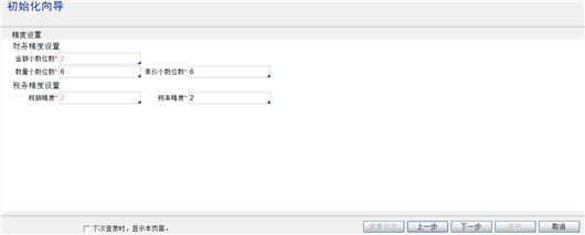 精度设置页面,主要设置财务和税务子系统金额、数量要保留的小数位,如下图所示。