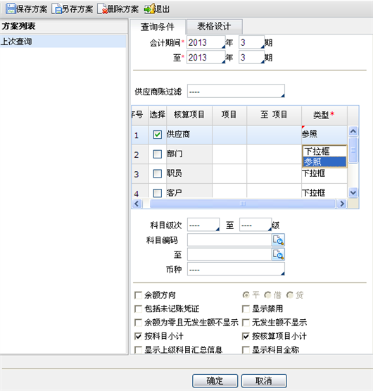 - 核算项目:选择所需查询的具体供应商代码或范围。