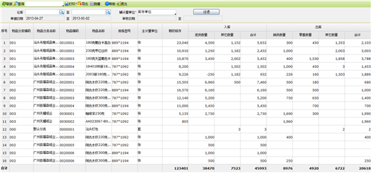 【主要功能】查询各仓库各物品各种业务的入库、出库及结存情况。
