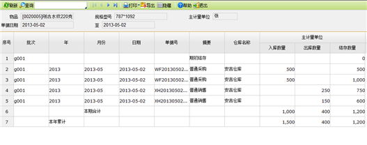 【主要功能】按物品批次查询各仓库各月份的进销存明细情况。