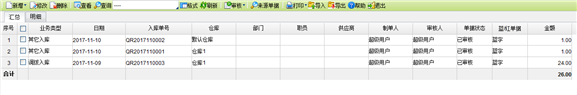 其它入库单列表中提供了新增、修改、删除、查看、刷新、查询、审核、来源单据、打印、导入、导出、帮助等功能,可以方便的对其它入库单进行查询和管理。