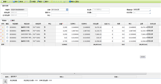 供应商物品编码:参照供应商物品对照表中物品属性为代销的数据录入,如果在供应商物品对照表中作了相应的设置先录入供应商、物品编码后系统会自动带出供应商物品编码。同样,先录入供应商、供应商物品编码也会自动带出相应的物品。如果对照表相应的对照关系不* ,则弹出选择框可供选录。