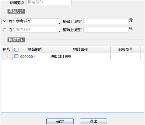 系统提供两种调整方式,一种是在“参考报价”或“指定报价”的基础上调整一定的数额,另一种是在“参考报价”或“指定报价”的基础上调整一定的百分比。例如,在“参考报价”的基础上调增100元,则选中* 种方式,并录入金额100元,点击“确定”按钮后,系统返回到客户价格表列表中,此时每条记录均在“参考报价”的基础上调了100元。如果想统一调减,在此处可以录入负数。请根据需要选择调整方式。
