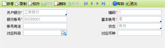 2、通过“新增、修改、删除、禁用”按钮可以对银行账号进行维护。在银行账号页面,双击某一银行账号,进入银行账号编辑页面,如下图所示:
