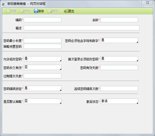 【第二步】在密码策略页面,点击〖新增〗按钮,打开密码策略新增窗口。如下图所示: