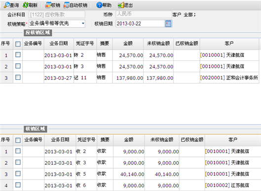 金额相等优先:在一个核销区域内,遵循金额相等的优先自动核销。