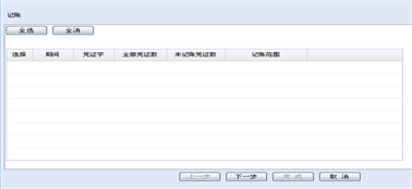 【第三步】选中记账范围后点击〖下一步〗,系统进入记账向导第二步,显示需要记账的凭证列表,如下图所示