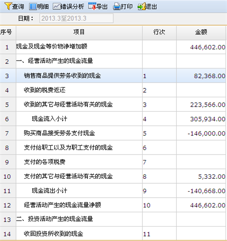 【主要功能】按现金流量表整表展开,根据主表得到的现金及现金等价物净增加额与附表的现金及现金等价物净增加额进行比对,进行错误分析。若生成的现金流量表有误,还可以进行详细错误分析,查出未指定的数据。