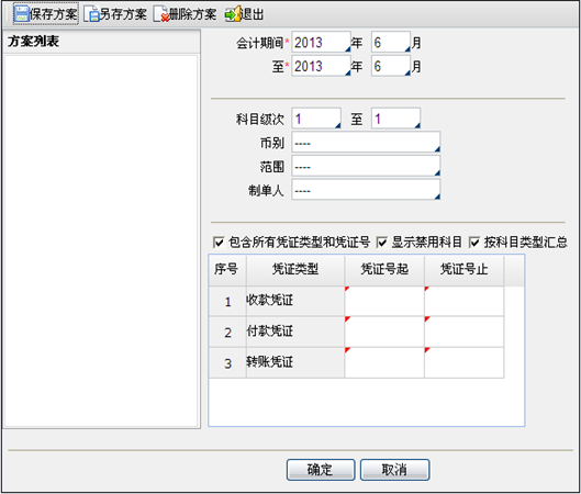 在此页面可以设置会计期间、科目级次、币别、范围、制单人、凭证范围、凭证起止号段等。