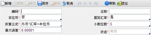 【第三步】修改币种,并通过〖保存〗按钮进行保存。此处只能修改币种“代码、名称、固定汇率、折算公式、小数位数、最大误差”信息。若系统未结束初始化,且该币种和已设为本位币的币种均未被引用,则可更改本位币。