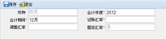 【第三步】修改汇率,并通过〖保存〗按钮进行保存。此处只能修改汇率“会计年度、会计期间、记账汇率、调整汇率”信息。
