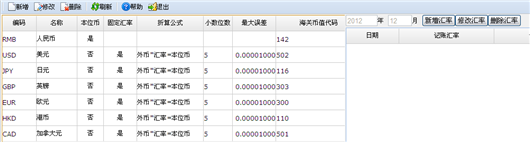 系统预置了人民币,如果用户需要使用其它币种进行核算,可以在此进行设置。如下图所示