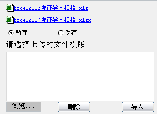 【第二步】点击〖浏览〗按钮选择要导入的凭证模板,点击〖导入〗按钮,即可导入凭证。若选择“暂存”,则所导入的凭证全部为暂存状态,若选择“保存”,则所导入的凭证全部为有效保存状态。导入凭证前应导入或录入所有相关基础数据,如:科目,辅助项,币种等,否则凭证导入不成功。