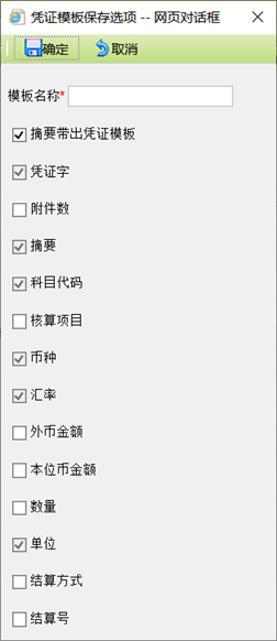 用户勾选需要保存的项目,录入模板名称,点击〖确定〗按钮,即可保存模板。凭证需保存后才可保存为凭证模板。