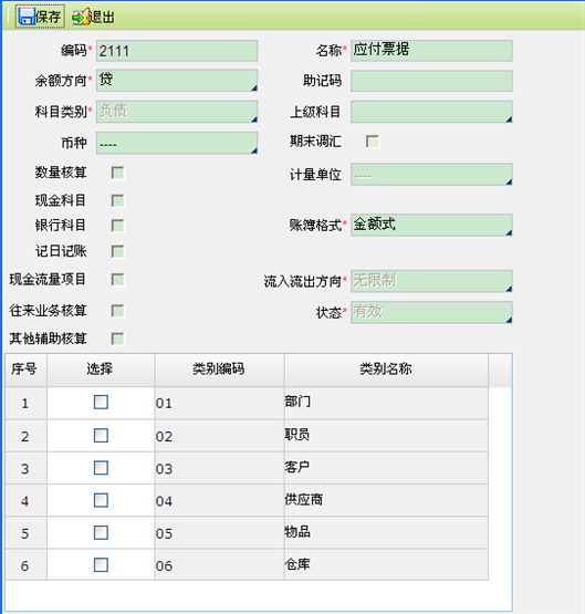 【第三步】输入会计科目的代码、名称、余额方向科目类别等信息。代码、名称、余额方向、科目类别为必输项。对于有辅助核算的科目直接在相应的核算项目处打“√”。