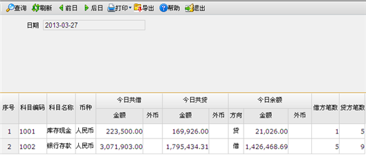 2.点击〖前日〗、〖后日〗按钮,可查看前一日和后一日的资金日报表。