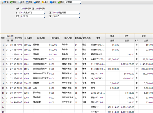 - 跨期累计:在查询出符合条件的记录后,仅有一个合计项;按照年,月,日,凭证字,科目,客户所属地区(客户类别,业务员,部门),项目排序;
