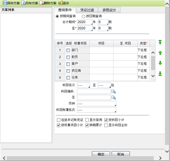 - 核算项目:选择所需查询的辅助核算,并可录入具体辅助项范围进行查询。可同时勾选多个辅助核算,多个辅助核算之间是并的关系。如:同时勾选“部门”和“职员”,则显示带部门和职员核算的科目,不显示只带部门或只带职员的科目。